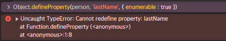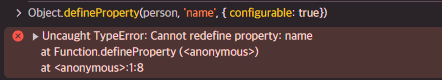 프로퍼티의 configurable이 false라서 프로퍼티는 삭제 및 프로퍼티를 재정의 할 수 없다.