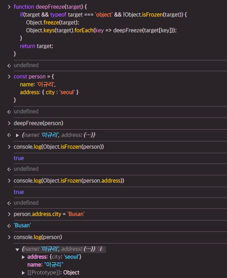 동결된 객체는 프로퍼티 추가 및 삭제, 값 갱신은 물론 프로퍼티 어트리뷰트의 재정의도 금지된다.