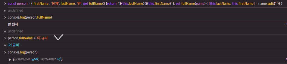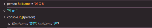 마찬가지로 접근자 프로퍼티 fullName으로 데이터 프로퍼티의 값을 저장하면, 위에서 정의한 setter 함수가 호출된다.