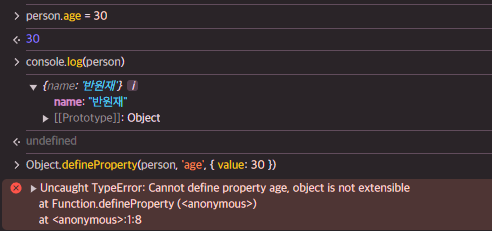 프로퍼티 추가를 금지한다. 즉, 동적으로 추가하는 방법(person.${키} = ${값})과 Object.defineProperty 모두 금지된다.
