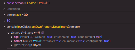 트프로퍼티 어트리뷰트에 직접 접근할 순 없지만, Object.getOwnPropertyDescriptor메소드를 통해 간접적으로 접근이 가능하다.