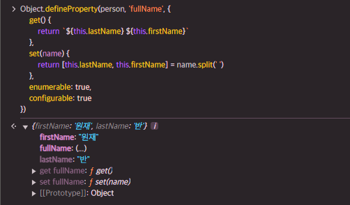 Object.getOwnPropertyDescription으로 접근자 프로퍼티 fullName의 프로퍼티 어트리뷰트를 확인할 수 있다.