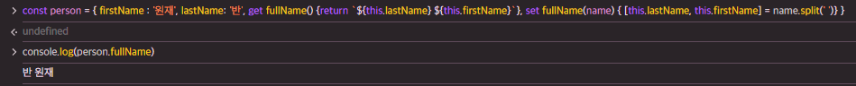 접근자 프로퍼티 fullName으로 데이터 프로퍼티의 값에 접근하면, 위에서 정의한 getter 함수가 호출된다.