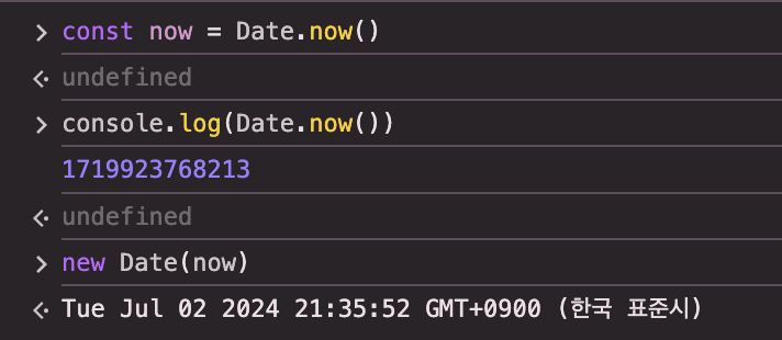 반환된 Date 객체는 내부적으로는 정수값을 갖지만, 콘솔에 출력하면 기본적으로 날짜와 시간 정보를 출력한다.