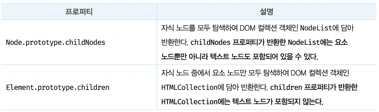 - 자식 노드 중에 텍스트 노드가 아닌 요소 노드가 존재하는 지 확인 하려면 children.length 또는 Element 인터페이스의 childElementCount 프로퍼티를 사용한다.