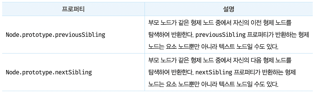 - 부모 노드가 같은 형제 노드를 참색하려면 다음과 같은 노드 탐색 프로퍼티를 사용한다.