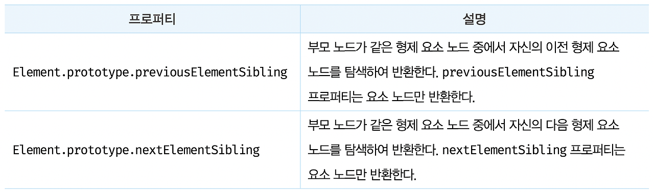 - Element.prototype이 제공: previousElementSibling, nextElementSibling, children 프로퍼티