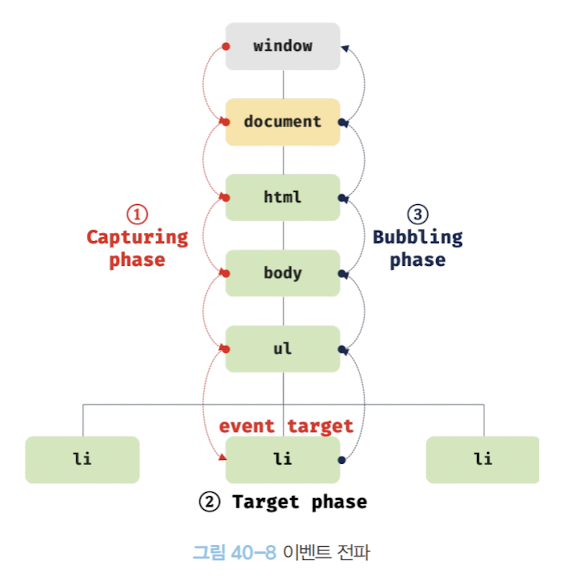- 이벤트 전파는 이벤트 객체가 전파되는 방향에 따라 3단계로 구분된다.
