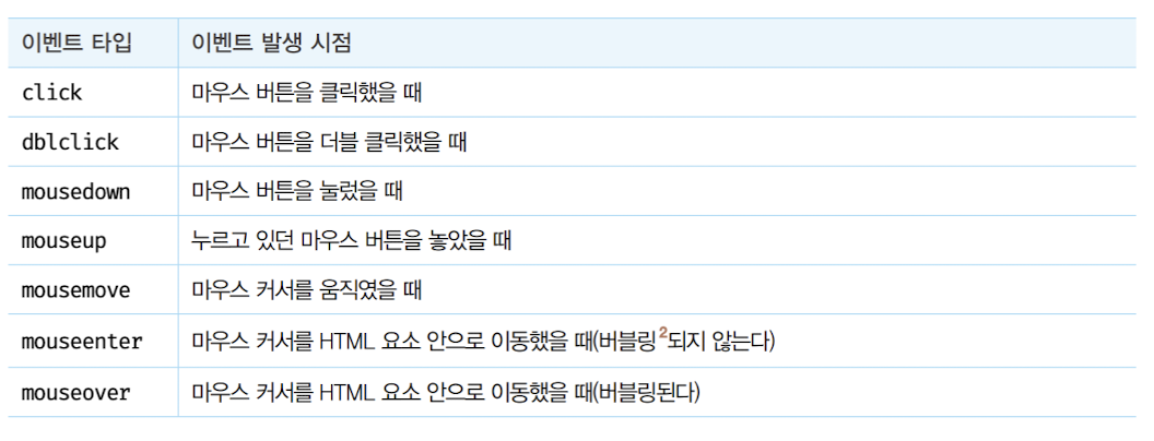 - click, mousup 등 이벤트가 발생하면 생성되는 MouseEvent 타입의 이벤트 객체는 다음과 같은 고유의 프로퍼티를 갖는다.