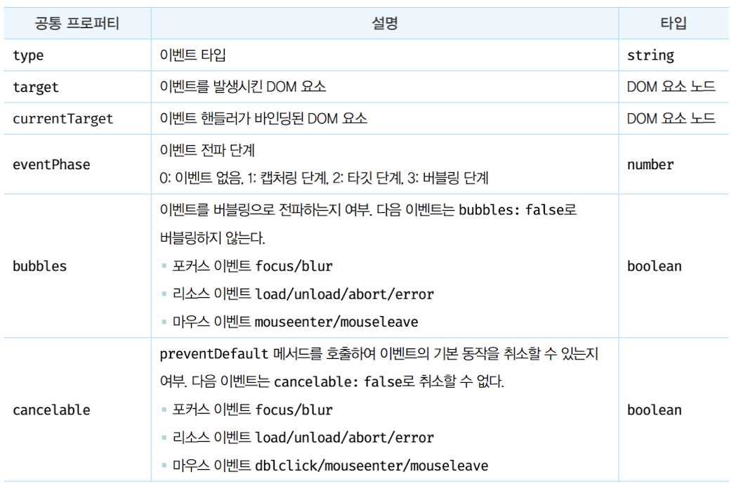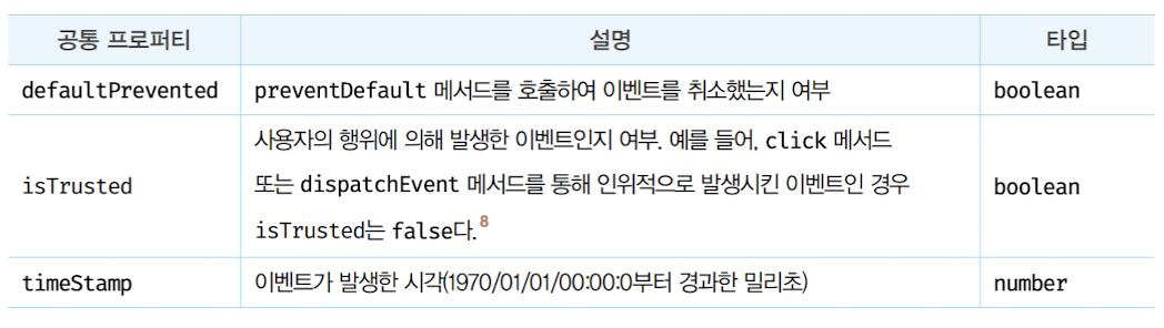 - Event 인터페이스(=Event.prototype)에 정의되어 있는 이벤트 관련 프로퍼티는 UIEvent, CustomEvent 등 모든 이벤트 객체가 상속받는 공통 프로퍼티다.