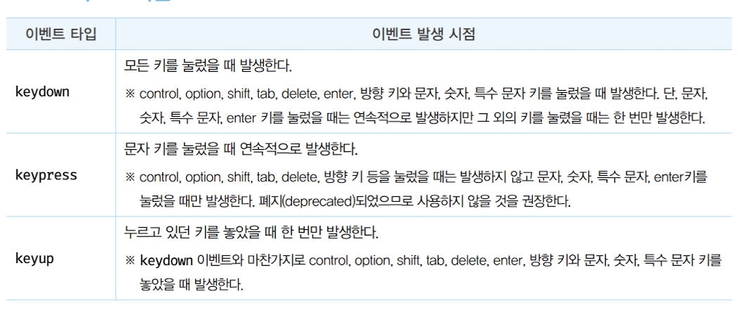 - keypress 등 이벤트가 발생하면 생성되는 keyBoardEvent 타입의 이벤트 객체는 altKey, ctrlKey, shiftKey, metaKey, key, keyCode 같은 고유의 프로퍼티를 갖는다.