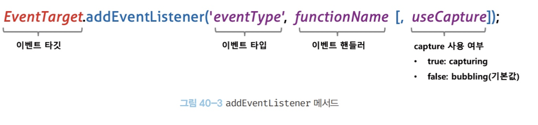 - addEventListener 메소드의 첫 번째 매개변수에는 이벤트 타입을, 두 번째 매개변수에는 이벤트 핸들러를, 마지막 매개변수로는 이벤트 전파 단게를 지정한다.