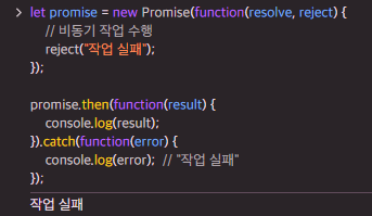 - 프로미스가 실패했을 때 실행되는 콜백 함수를 등록하는 데 사용된다.
