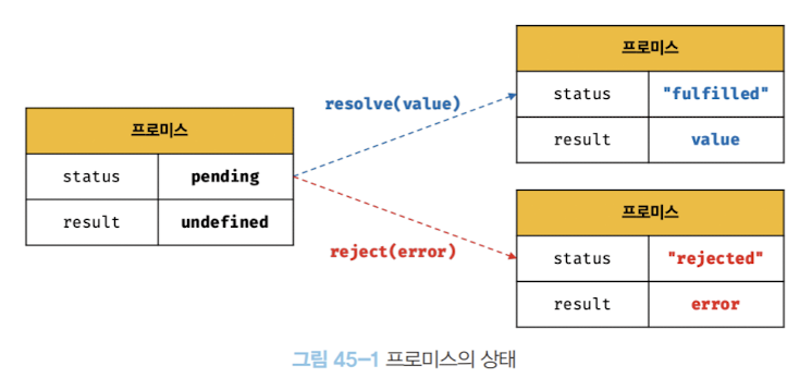 - 생성된 직후의 프로미스는 기본적으로 pending상태이고, 비동기 처리가 성공/실패하면 resolve/reject함수를 호출하여 프로미스를 fulfilled 혹은 rejected 상태로 변경한다.