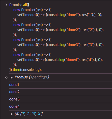 setTimeout(() =>{console.log("done4"); res("4");}, 0);