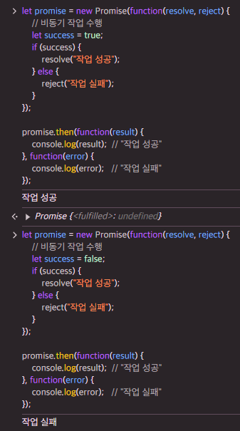 - Promise 생성자 함수가 인수로 전달받은 콜백 함수 내부에서 비동기 처리를 수행한다. 이 콜백 함수는 resolve와 reject 함수를 인수로 전달받는데, 비동기 처리가 성공하면 resolve 함수를 호출하고, 실패하면 reject 함수를 호출한다.