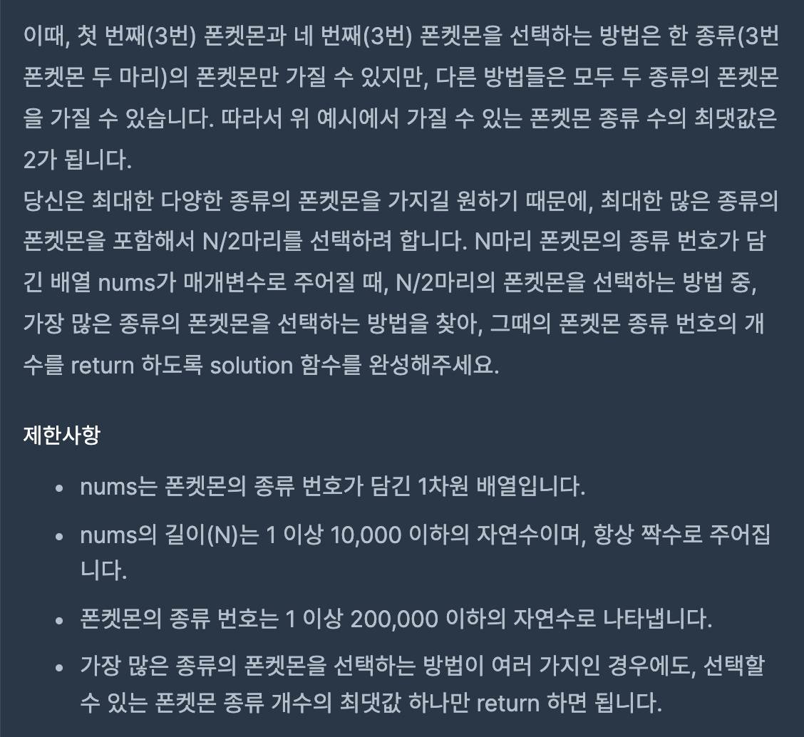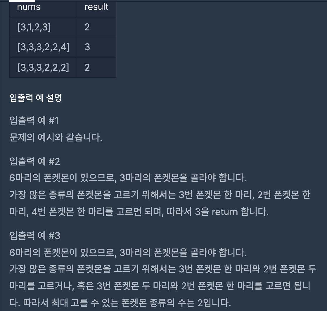 제일 다양한 포켓몬을 고를 수 있는 방법을 찾고 그에 해당하는 포켓몬 종류 번호의 개수를 리턴하는 문제.