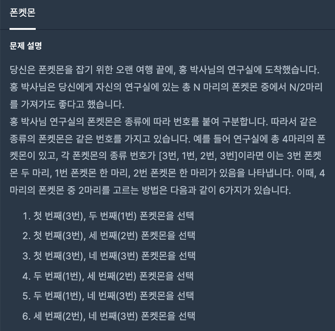 당신은 폰켓몬을 잡기 위한 오랜 여행 끝에, 홍 박사님의 연구실에 도착했습니다. 홍 박사님은 당신에게 자신의 연구실에 있는 총 N 마리의 폰켓몬 중에서 N/2마리를 가져가도 좋다고 했습니다.