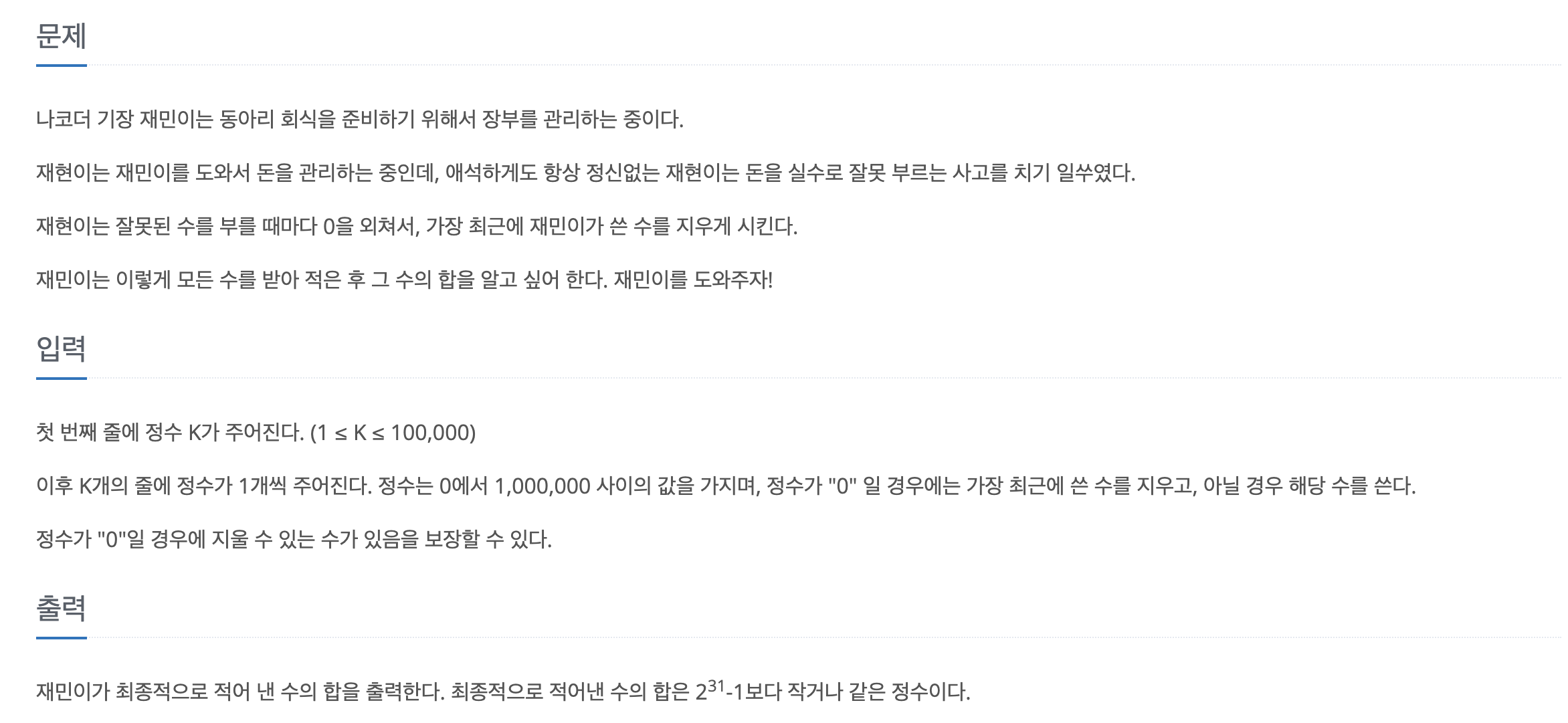 첫 번째 줄에 정수 K가 주어진다. (1 ≤ K ≤ 100,000) 이후 K개의 줄에 정수가 1개씩 주어진다. 정수는 0에서 1,000,000 사이의 값을 가지며, 정수가 "0" 일 경우에는 가장 최근에 쓴 수를 지우고, 아닐 경