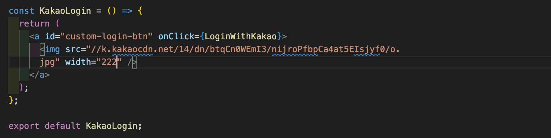 이렇게 코드를 완성했다! 물론 쟤는 카카오 로그인 실행 함수이므로 onClick으로 달아줄 버튼은 밑에 따로 작성해야한다!
