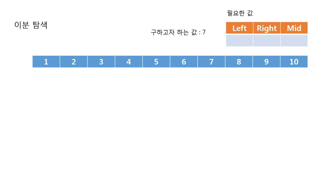 - 시작과 끝, 그리고 그 중간을 나타내는 변수를 사용하여 탐색한다.