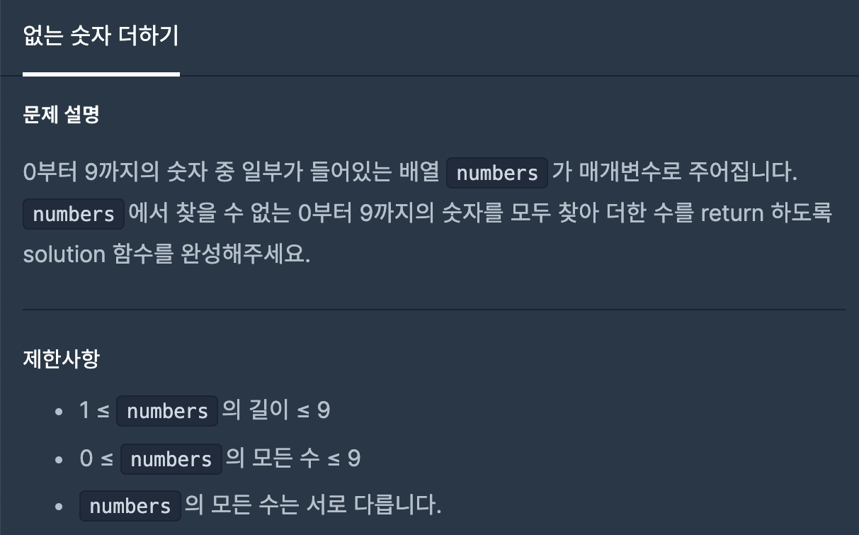 생각했던 두 번째 방법은 바로 0~9까지의 총합인 45에서 있는 값들을 빼는 것.