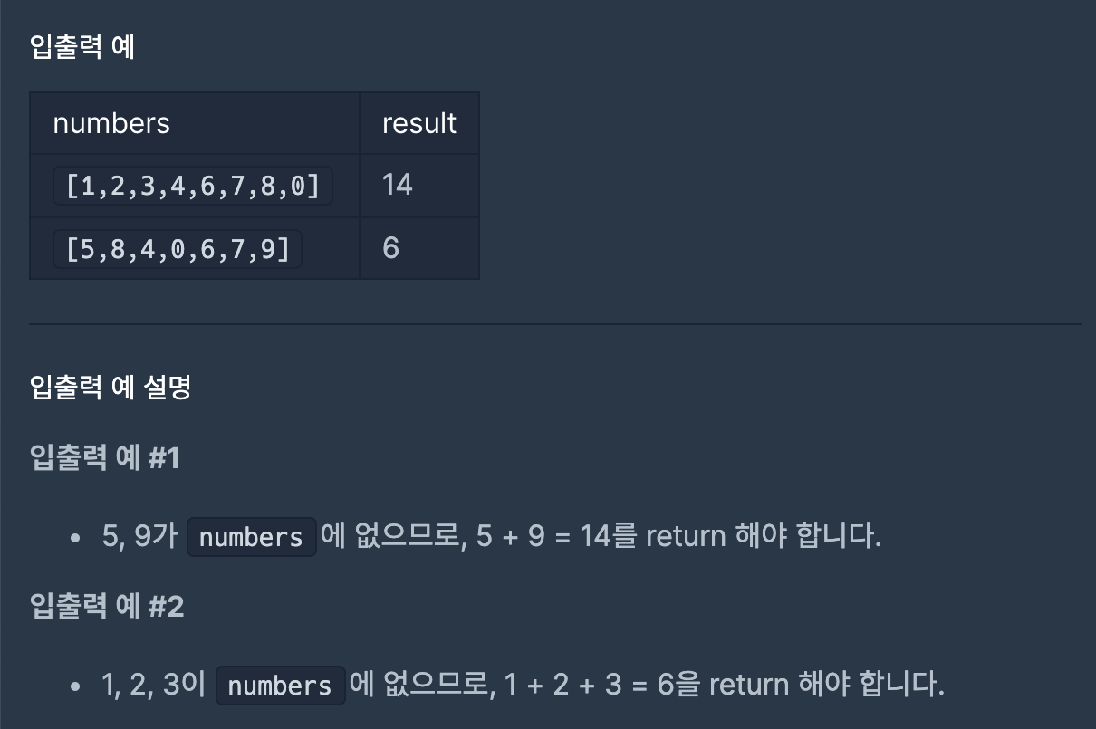 - 문제 그대로, 없는 값을 찾아서 그 값들의 합을 구한다.