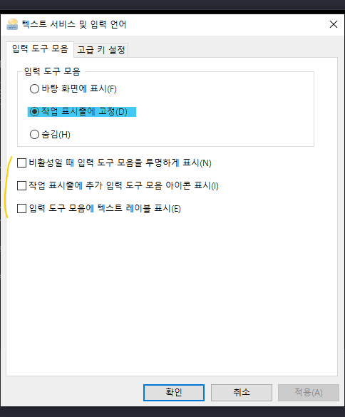입력도구 모음은 작업표시줄에 고정이나 아예 숨김을 해도 해상 현상을 발생하지 않았다.