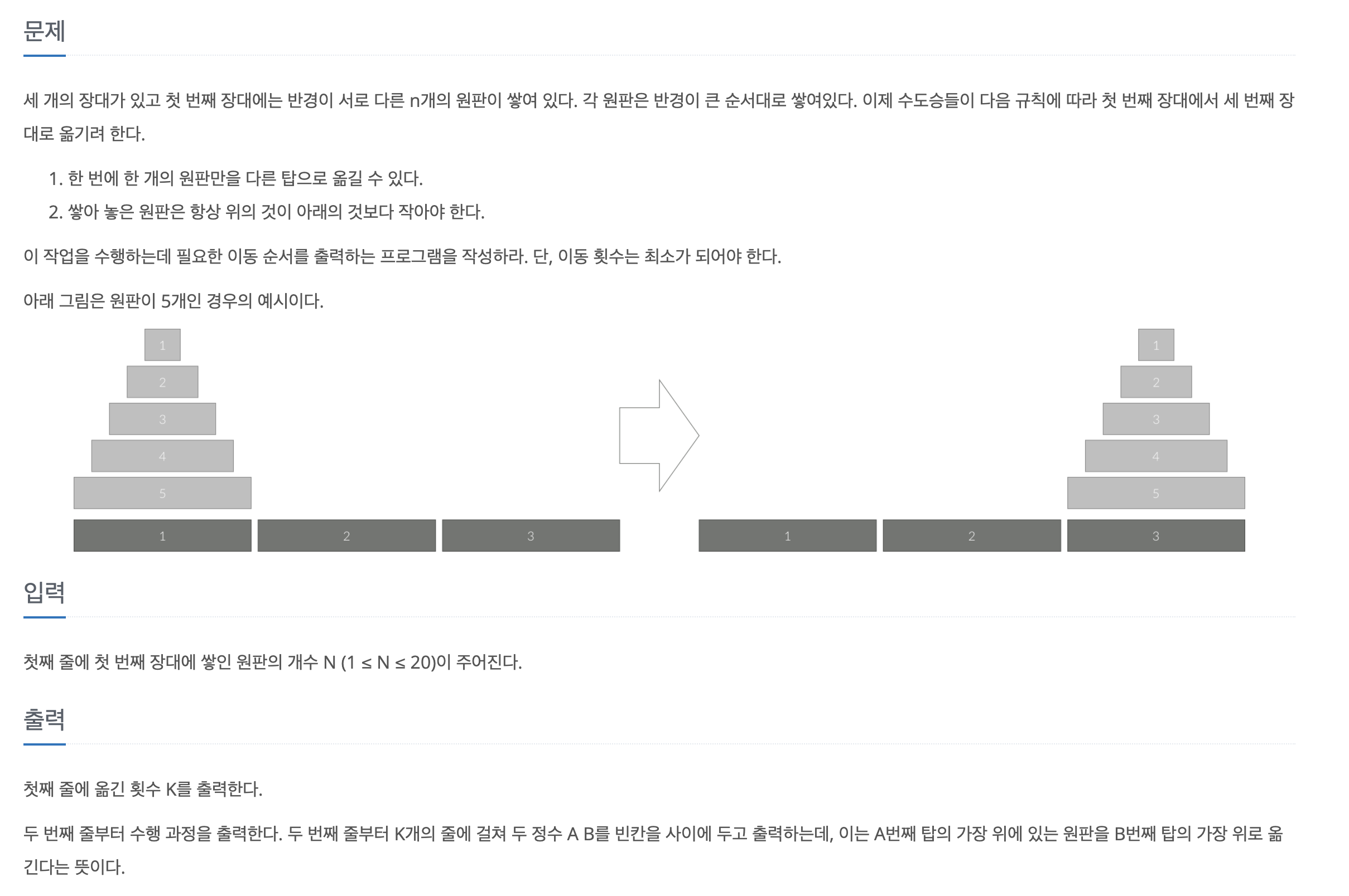 📝 문제 https://www.acmicpc.net/problem/11729 11729번: 하노이 탑 이동 순서 세 개의 장대가 있고 첫 번째 장대에는 반경이 서로 다른 n개의 원판이 쌓여 있다. 각 원판은 반경이 큰 순서대로 쌓여있다. 이제 수도승들이 다음 규칙에 따라 첫 번째 장대에서 세 번째 장대로 www.acmicpc.net ✍🏻 풀이 옛날에 재밌게 했던 컵에 있는 물 옮겨담는 게임같은 느낌! 예제와 출력을 통해 어떤 것을 구해야하는지 파악부터 했다. 3 입력값 3은 첫째 줄에 첫 번째 장대에 쌓인 원판의 개수 N (1 ≤ N ≤ 20)을 의미한다. 이걸 세번째 장대에 옮기는 횟수와 옮긴 과정(장대 번호, 옮긴 원판 번호) 을 출력하면 된다. 7 1 3 1 2 3 2 1 3 2 1 2 3 1 3 ..